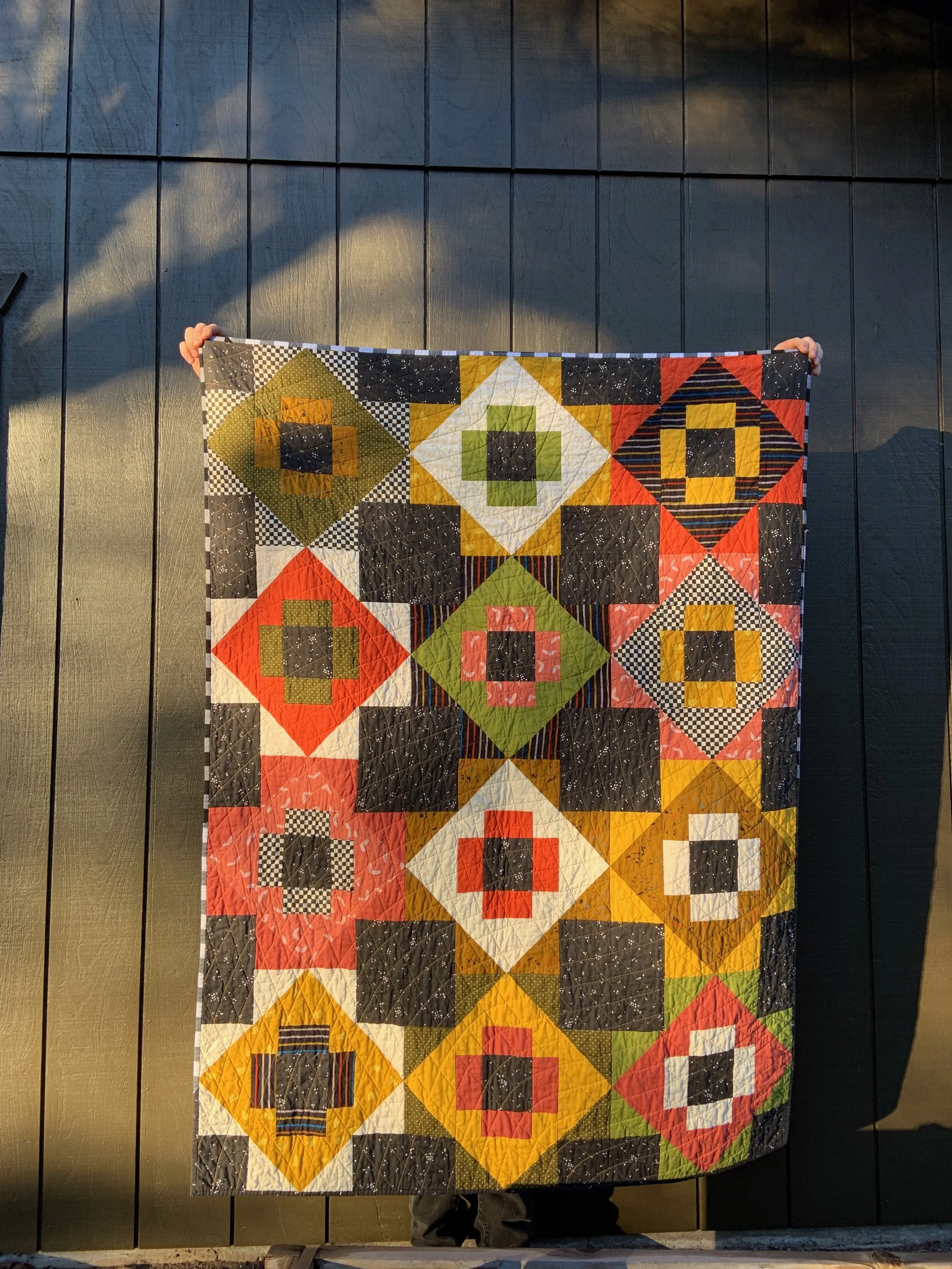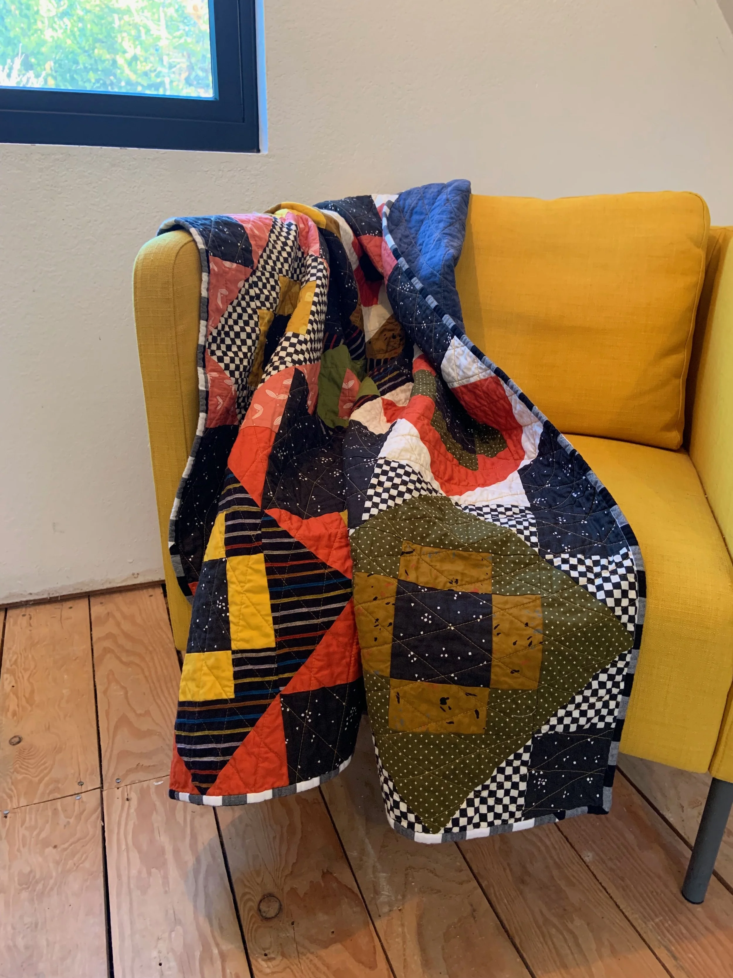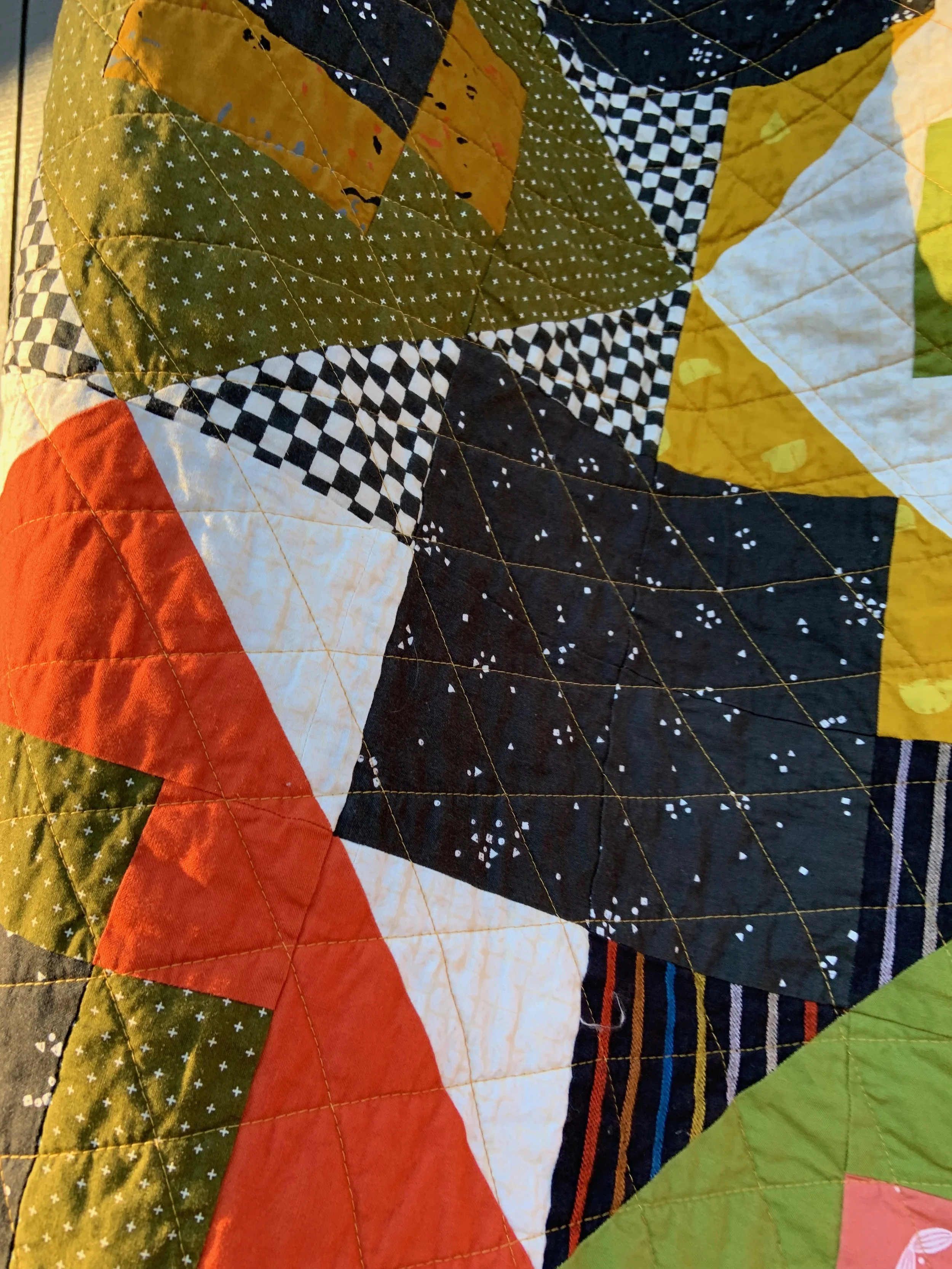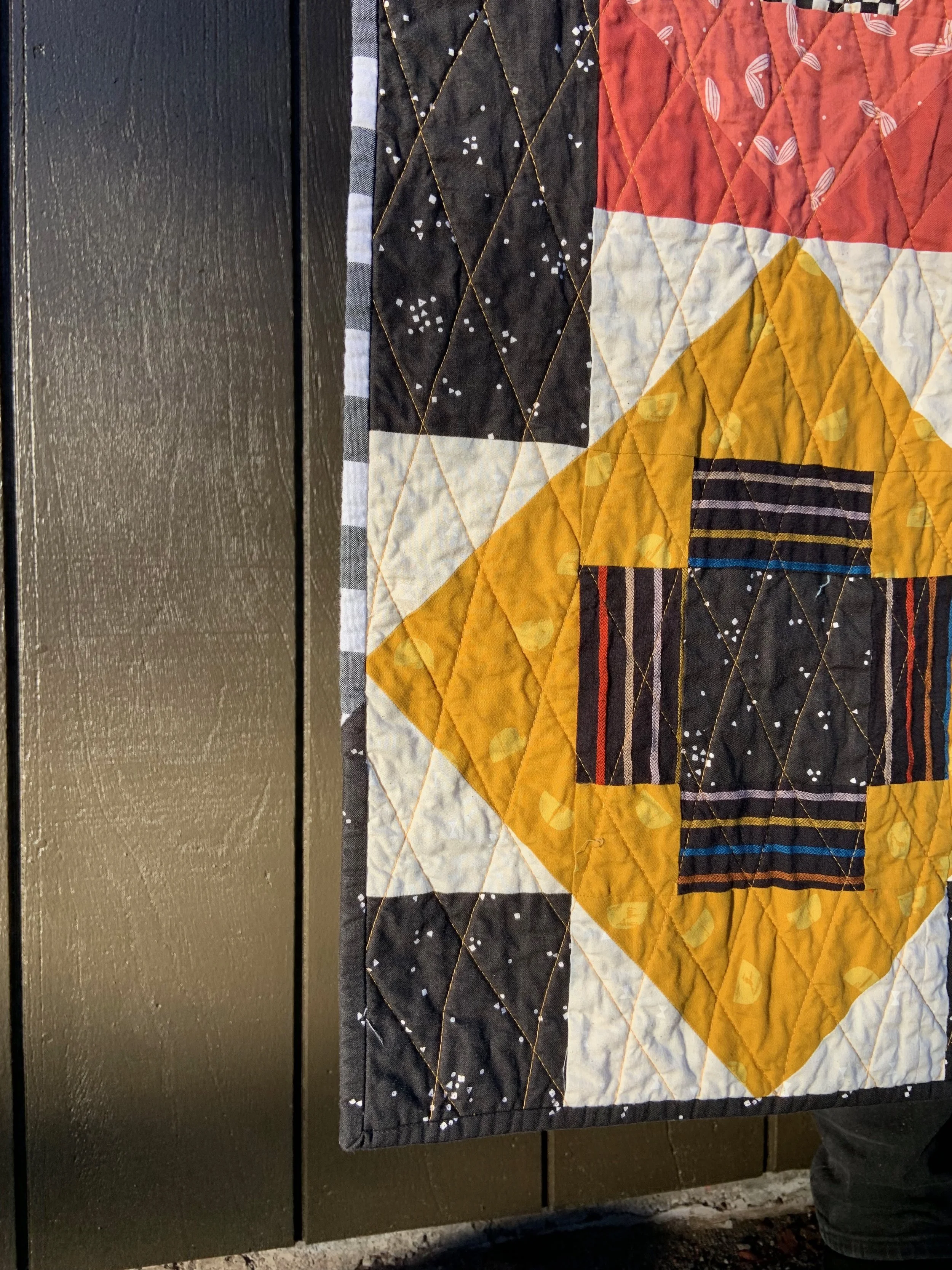 After winning a custom curated fabric bundle from Portland quilt pattern designer, Meghan from Then Came June, I decided that the best pattern to use was one of Meghan's! I loved making her Meadowland quilt a couple of years ago and so created a slightly smaller version to utilize all the fabrics I received. I added the black background with clusters of small geometric white shapes, which spills into the binding on the bottom right. The backing is a tone on tone navy blue - a perfect compliment to the color palette on the front. A few remaining fat quarters were pieced together to create a scrappy black and white binding, which was hand sewn on the back. With all the deep color values, I chose a warm mustard yellow thread for the quilting to blend in a bit more than a white thread would. The way that color pops on the backing fabric is beautiful. The quilting design features a curvy X, but this time was sewn in all four directions, creating differing shapes when the diagonal lines intersect.