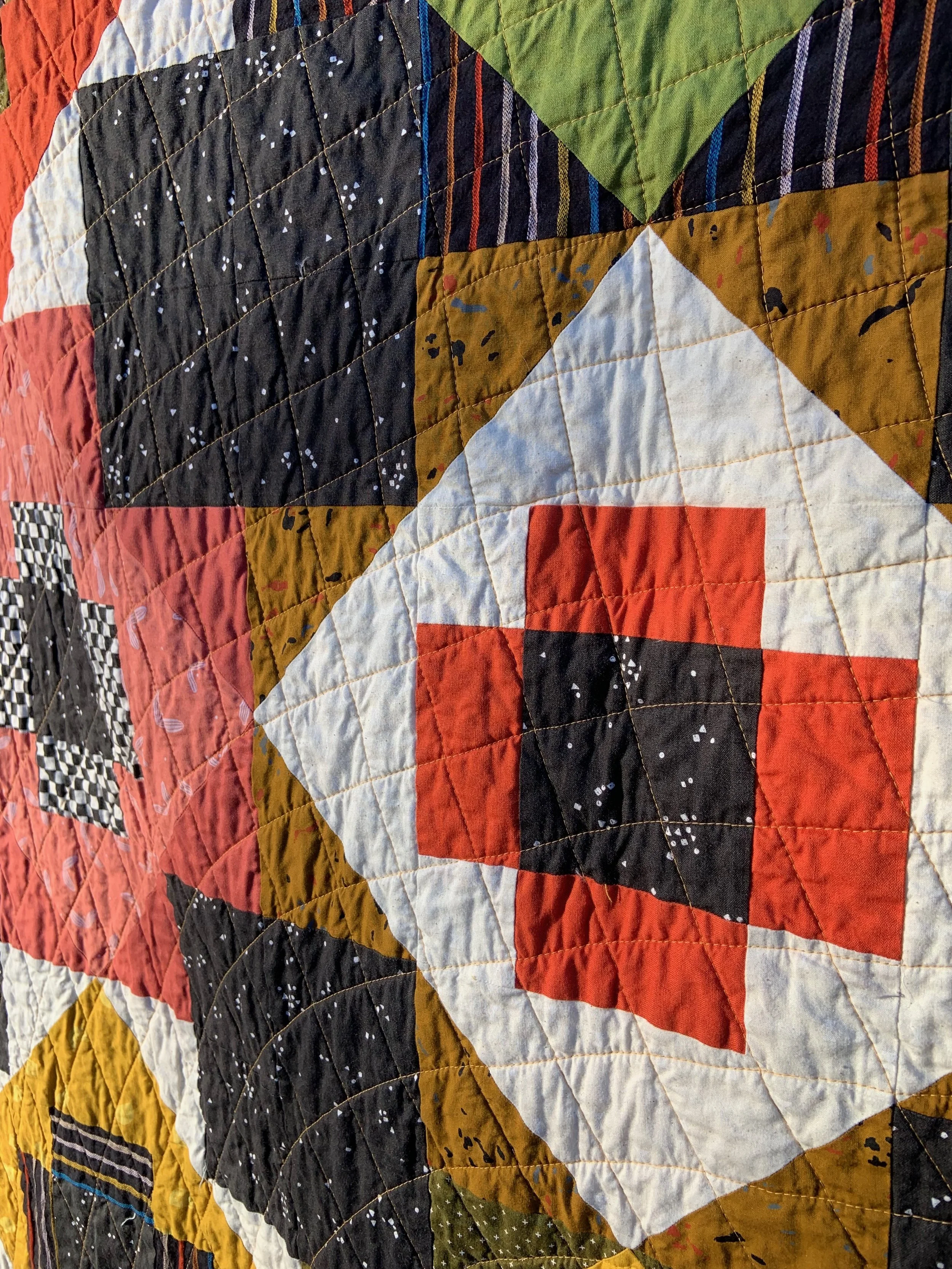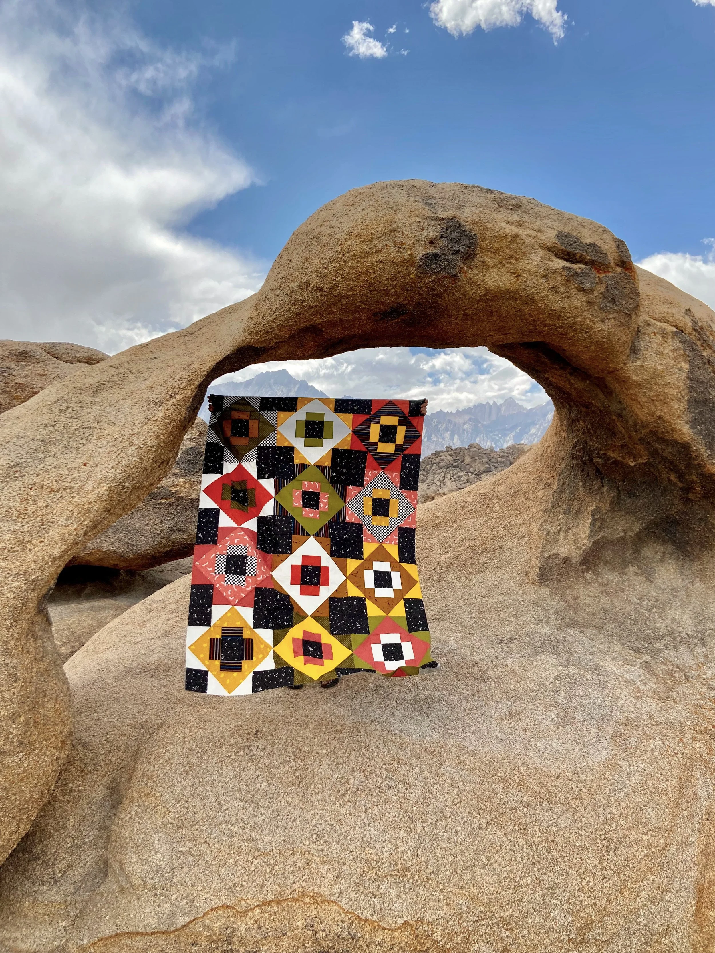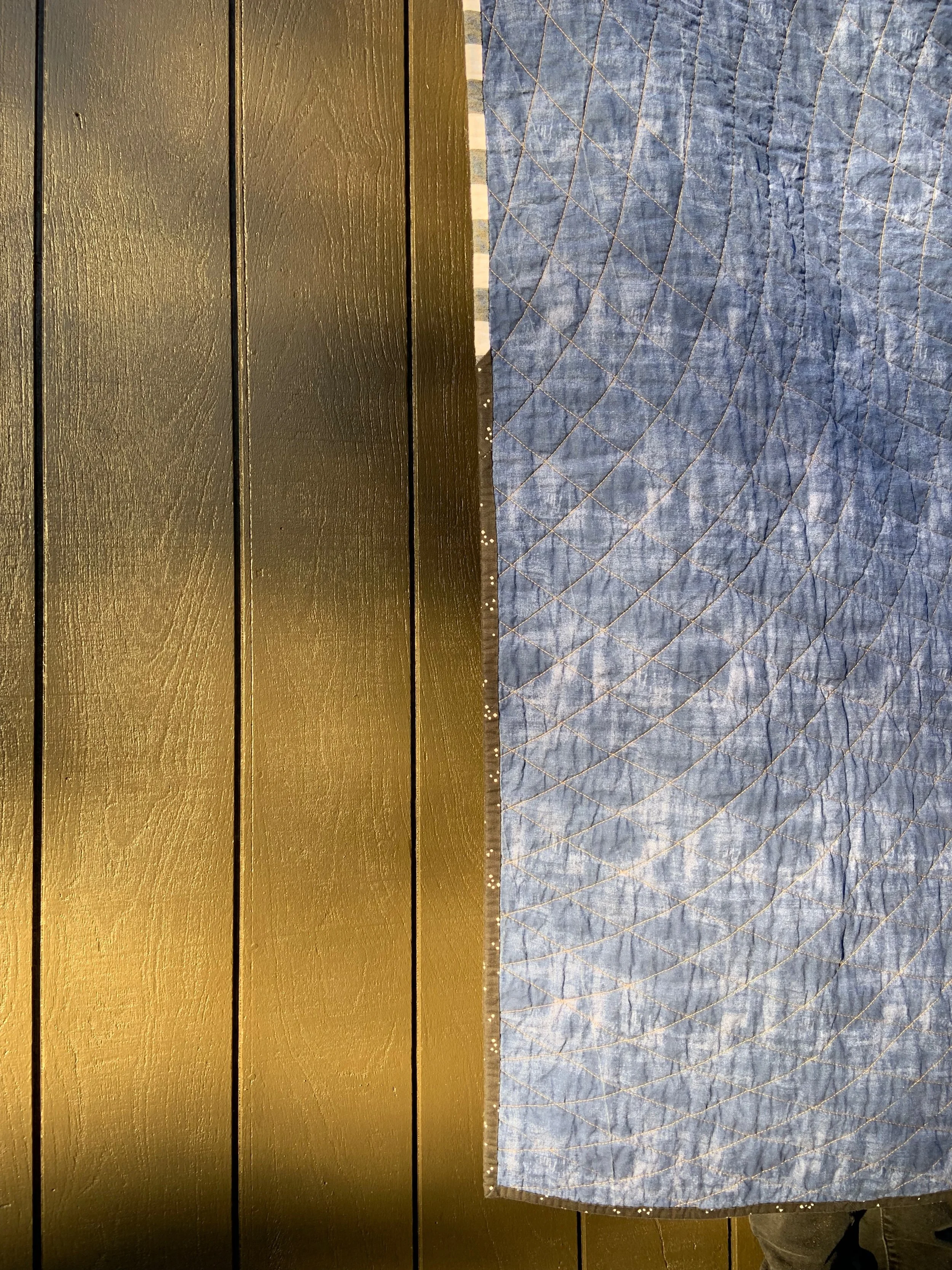 After winning a custom curated fabric bundle from Portland quilt pattern designer, Meghan from Then Came June, I decided that the best pattern to use was one of Meghan's! I loved making her Meadowland quilt a couple of years ago and so created a slightly smaller version to utilize all the fabrics I received. I added the black background with clusters of small geometric white shapes, which spills into the binding on the bottom right. The backing is a tone on tone navy blue - a perfect compliment to the color palette on the front. A few remaining fat quarters were pieced together to create a scrappy black and white binding, which was hand sewn on the back. With all the deep color values, I chose a warm mustard yellow thread for the quilting to blend in a bit more than a white thread would. The way that color pops on the backing fabric is beautiful. The quilting design features a curvy X, but this time was sewn in all four directions, creating differing shapes when the diagonal lines intersect.