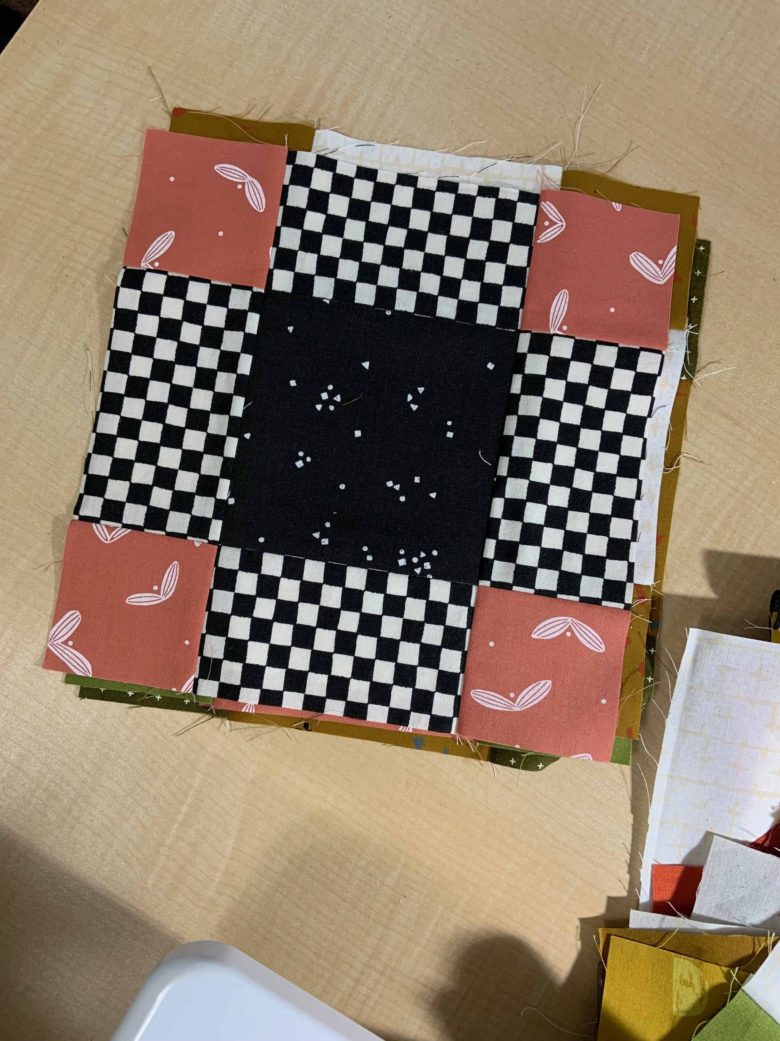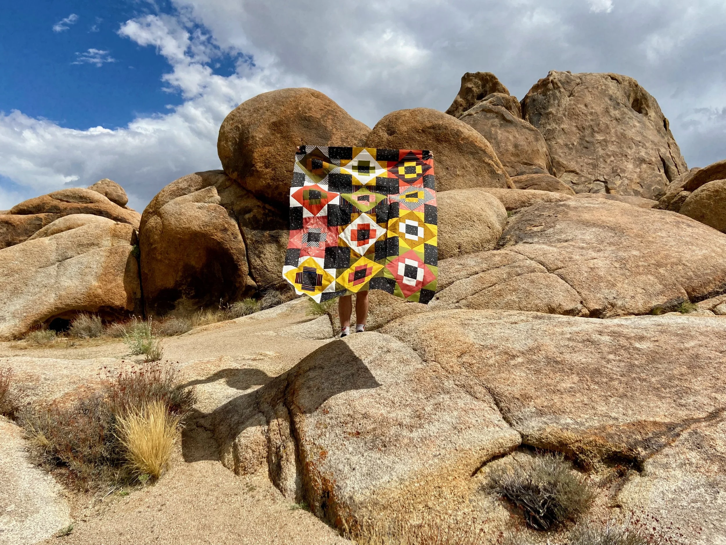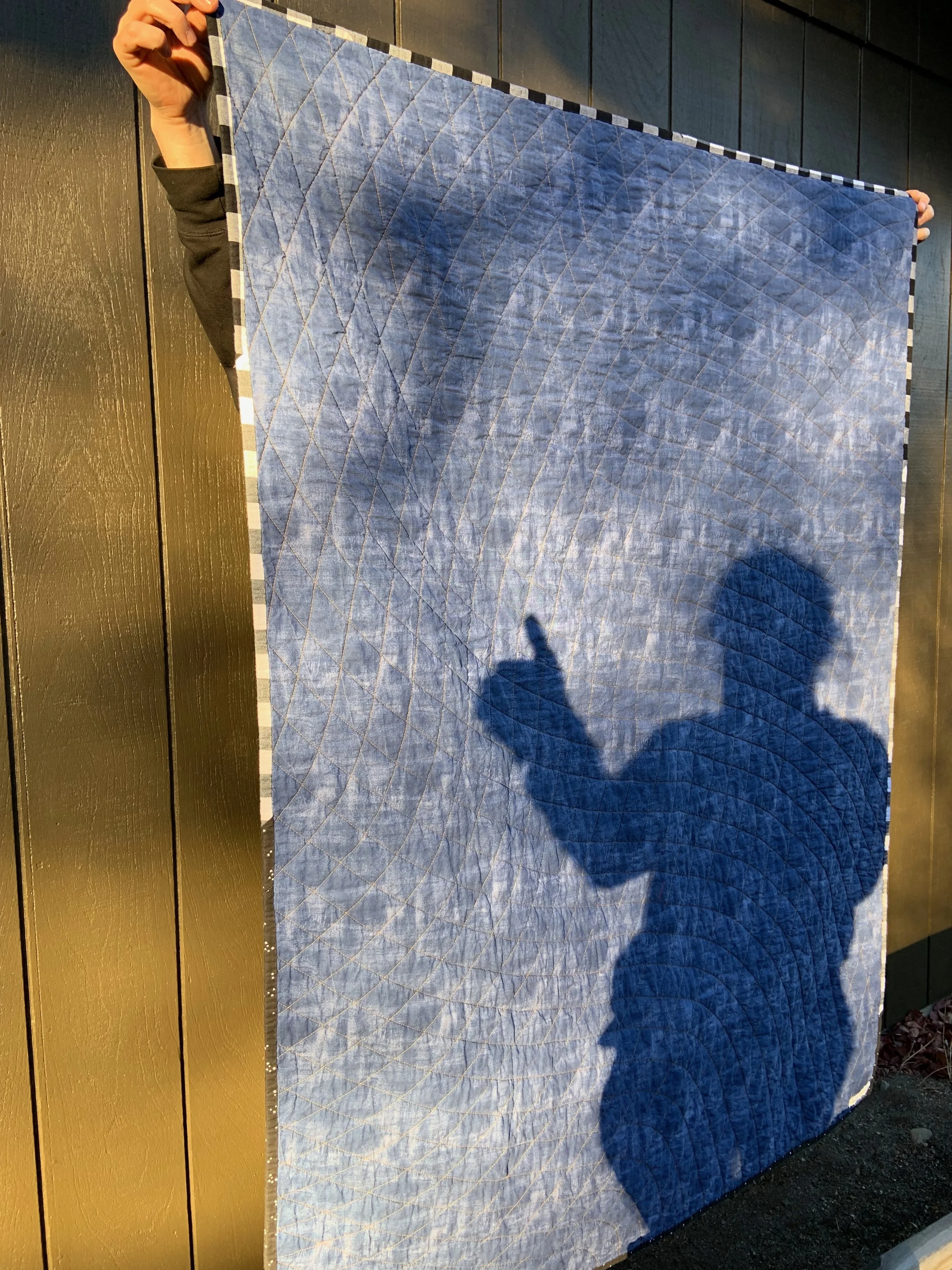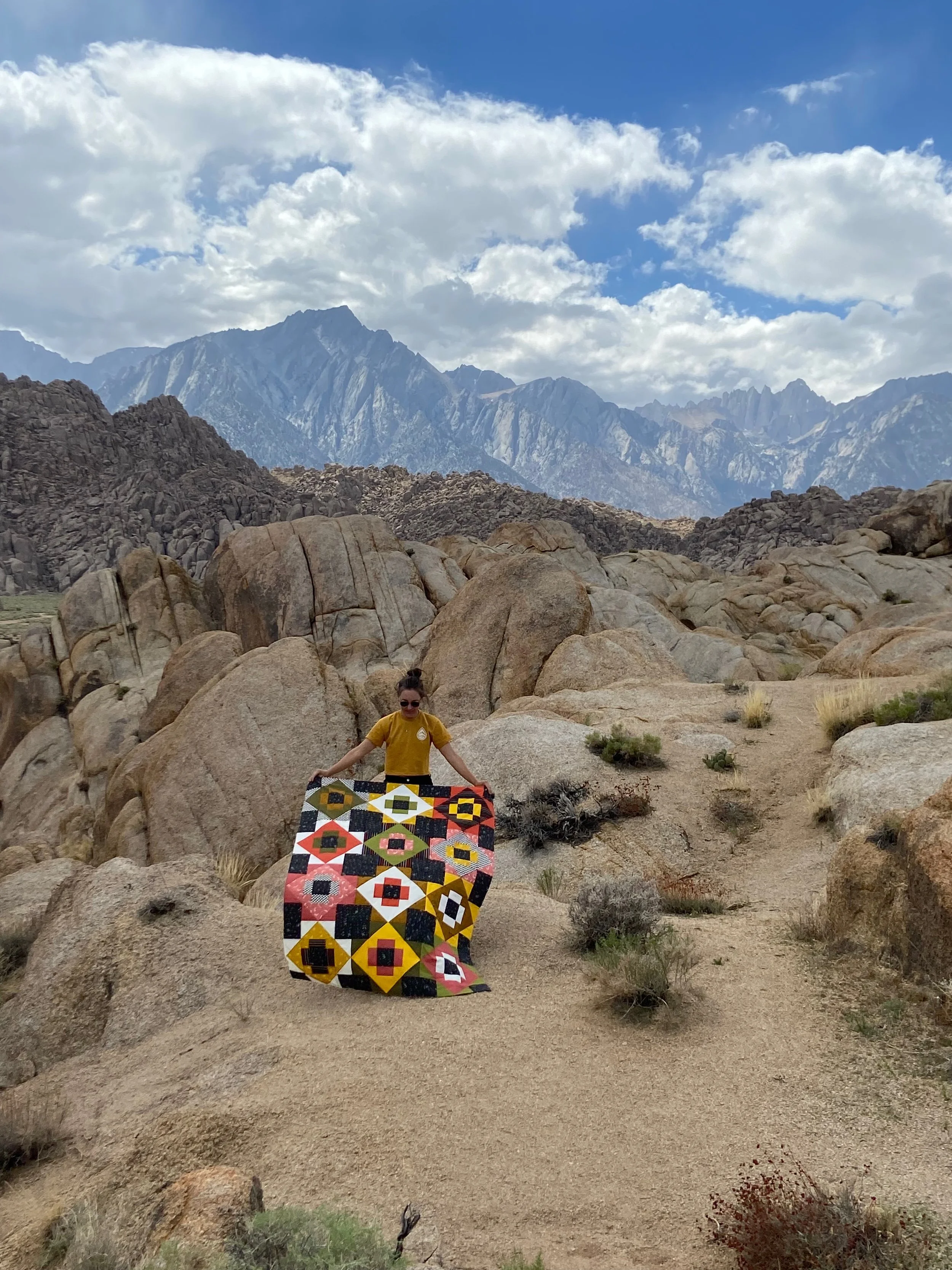 After winning a custom curated fabric bundle from Portland quilt pattern designer, Meghan from Then Came June, I decided that the best pattern to use was one of Meghan's! I loved making her Meadowland quilt a couple of years ago and so created a slightly smaller version to utilize all the fabrics I received. I added the black background with clusters of small geometric white shapes, which spills into the binding on the bottom right. The backing is a tone on tone navy blue - a perfect compliment to the color palette on the front. A few remaining fat quarters were pieced together to create a scrappy black and white binding, which was hand sewn on the back. With all the deep color values, I chose a warm mustard yellow thread for the quilting to blend in a bit more than a white thread would. The way that color pops on the backing fabric is beautiful. The quilting design features a curvy X, but this time was sewn in all four directions, creating differing shapes when the diagonal lines intersect.