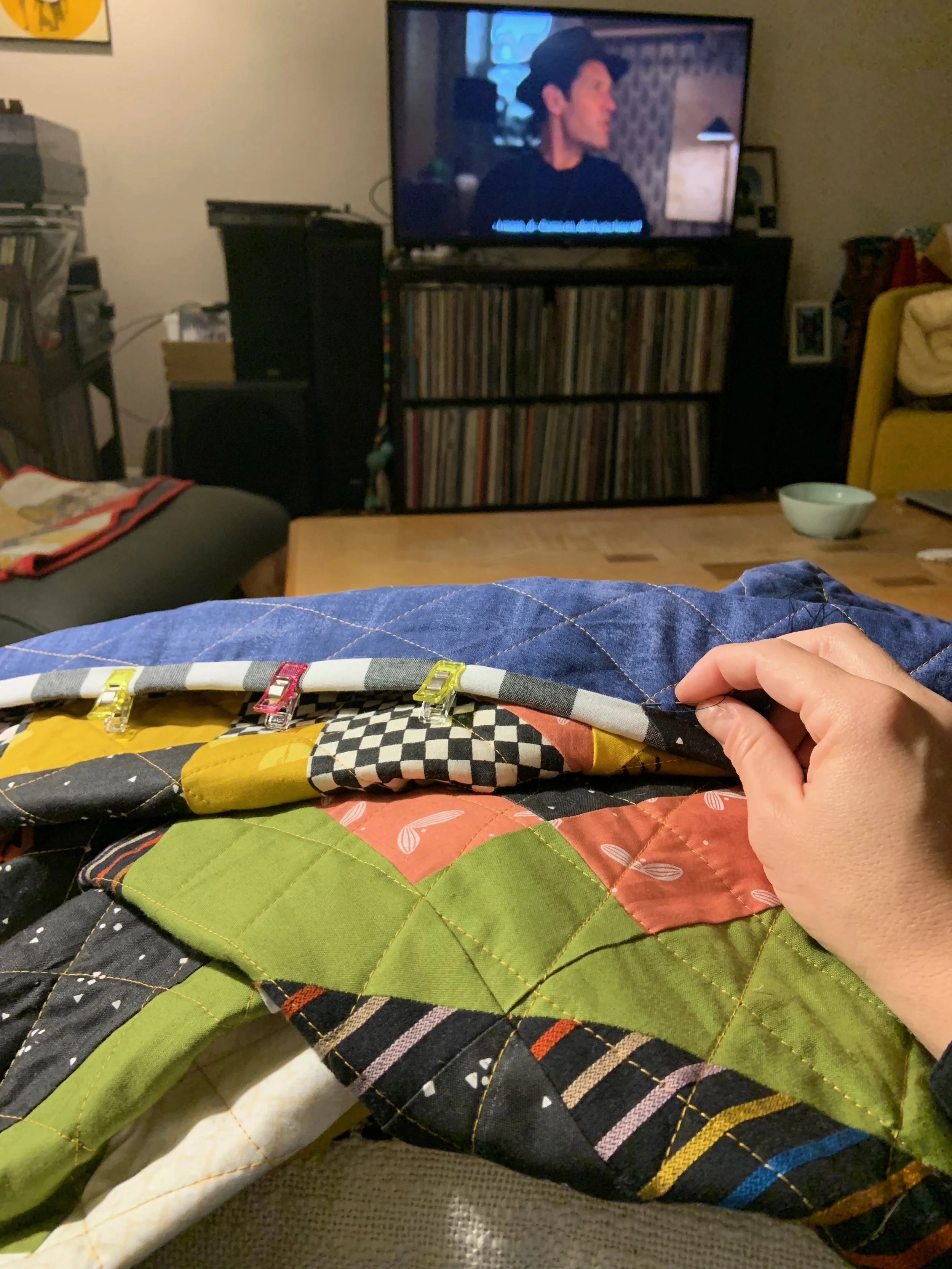 I grew very attached to this quilt as I put it together, so decided to keep it for myself :) It's the perfect size for working at home and car rides.